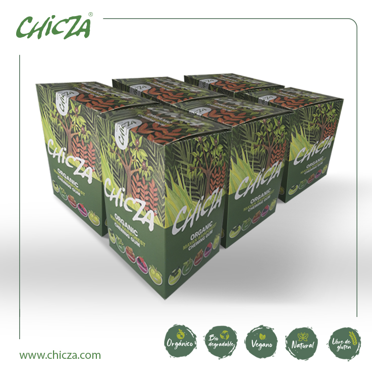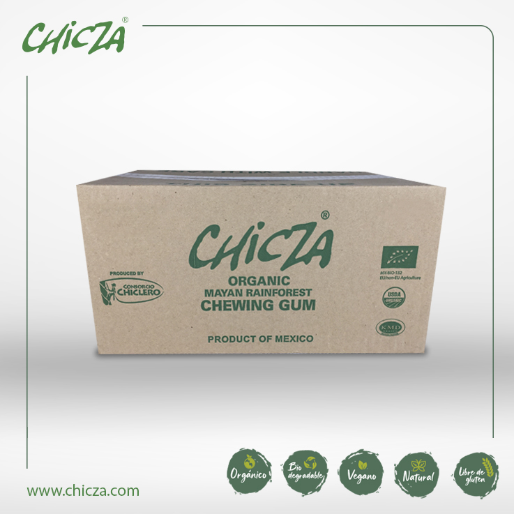 Características: goma de mascar orgánica de la selva maya, 100% orgánica certificada, biodegradable, vegana, natural, libre de gluten, kosher, sin conservadores, su consumo es apto para celíacos.