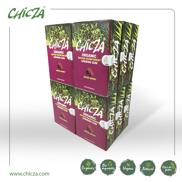 Características: goma de mascar orgánica de la selva maya, 100% orgánica certificada, biodegradable, vegana, natural, libre de gluten, kosher, sin conservadores, su consumo es apto para celíacos.